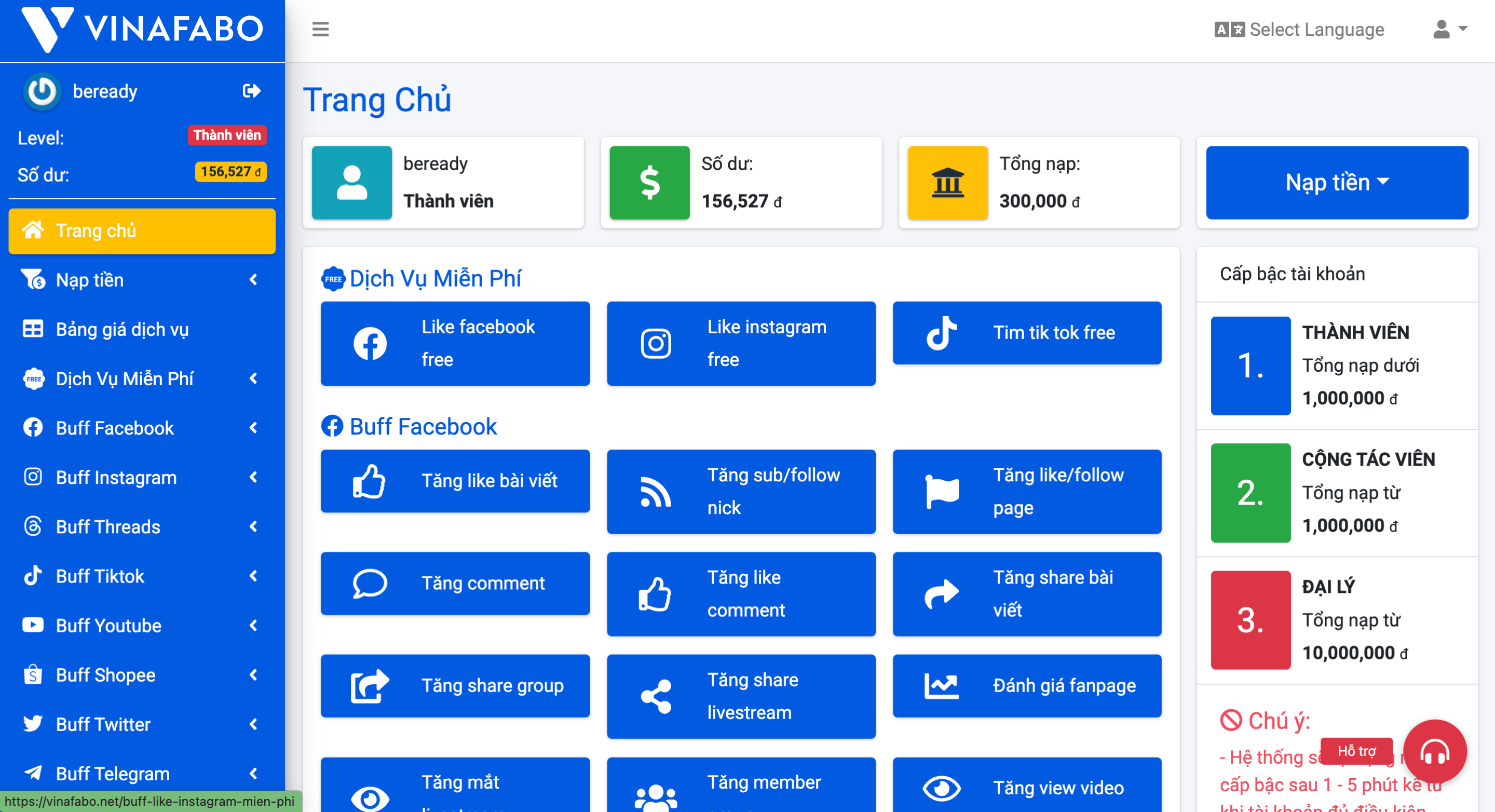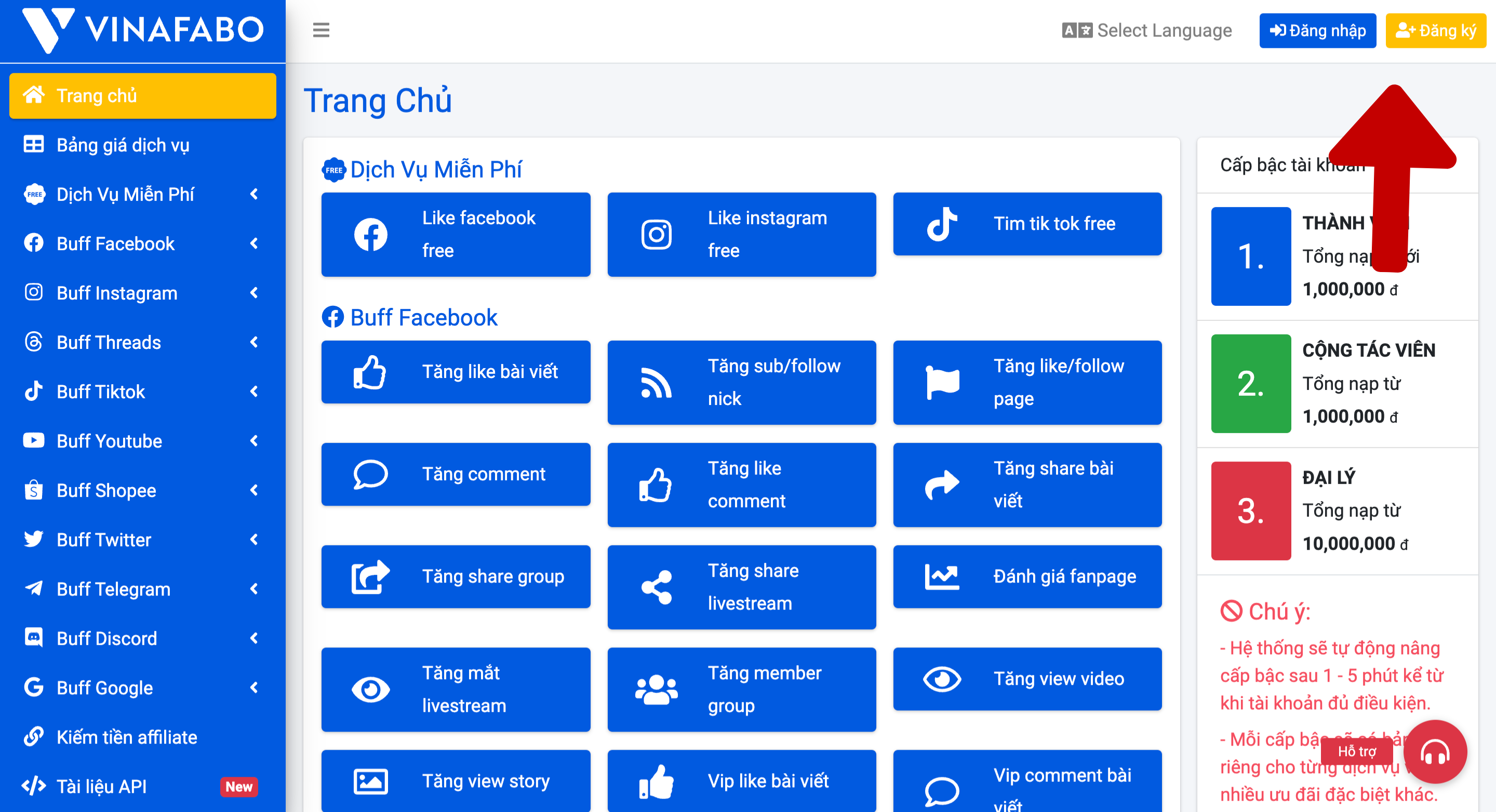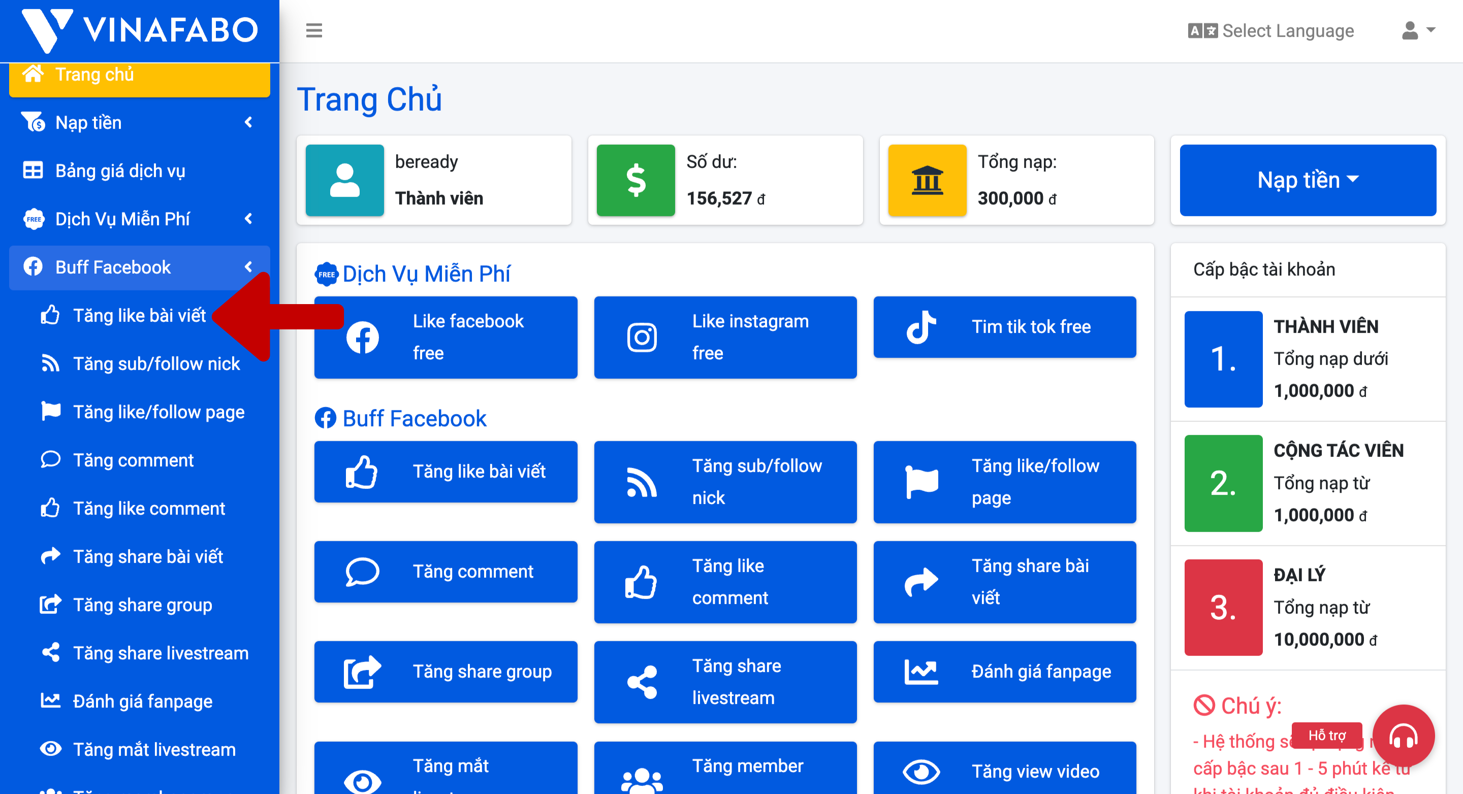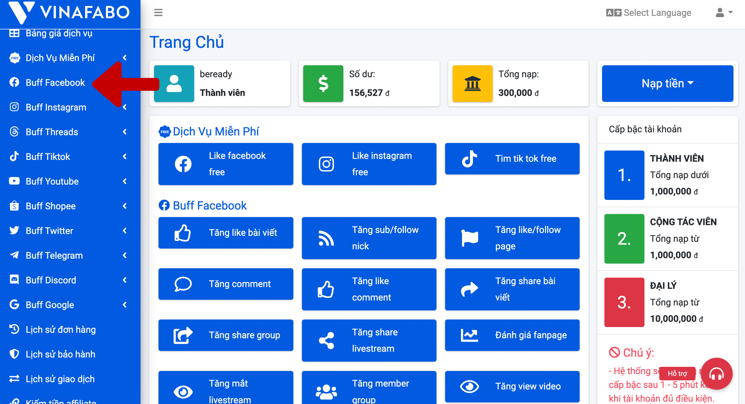 Bước 3: Click vào mục "Buff Faceboook"